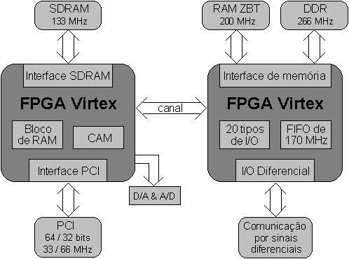 Como mostra o diagrama da figura 1, típico da aplicações usando dispositivos Virtex, ambas as famílias são capazes de operar com SDRAM de 133 MHz, RAM ZBT de 200 MHz e DDR de 266 MHZ.